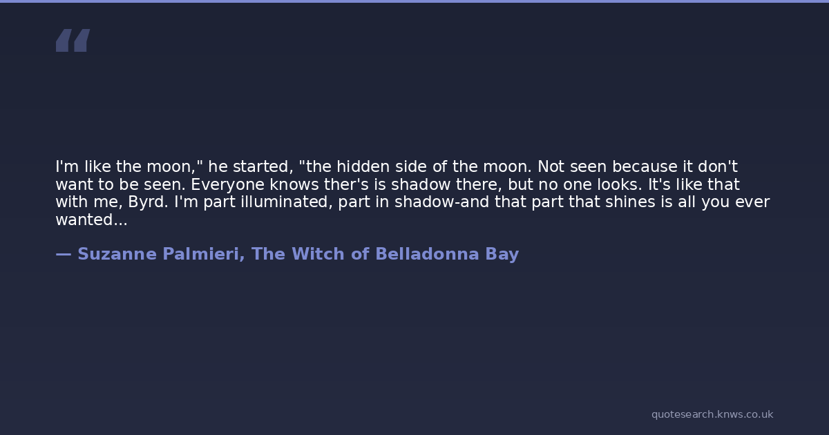 I'm like the moon," he started, "the hidden side of the moon. Not seen because it don't want to be seen. Everyone knows ther's is shadow there, but no one looks. It's like that with me, Byrd. I'm part illuminated, part in shadow-and that part that shines is all you ever wanted to see. But it kept getting smaller, and now it's dark. I'm a new moon now, Byrd. All there is, is shadow. Can you still see me? Do you still love me?
