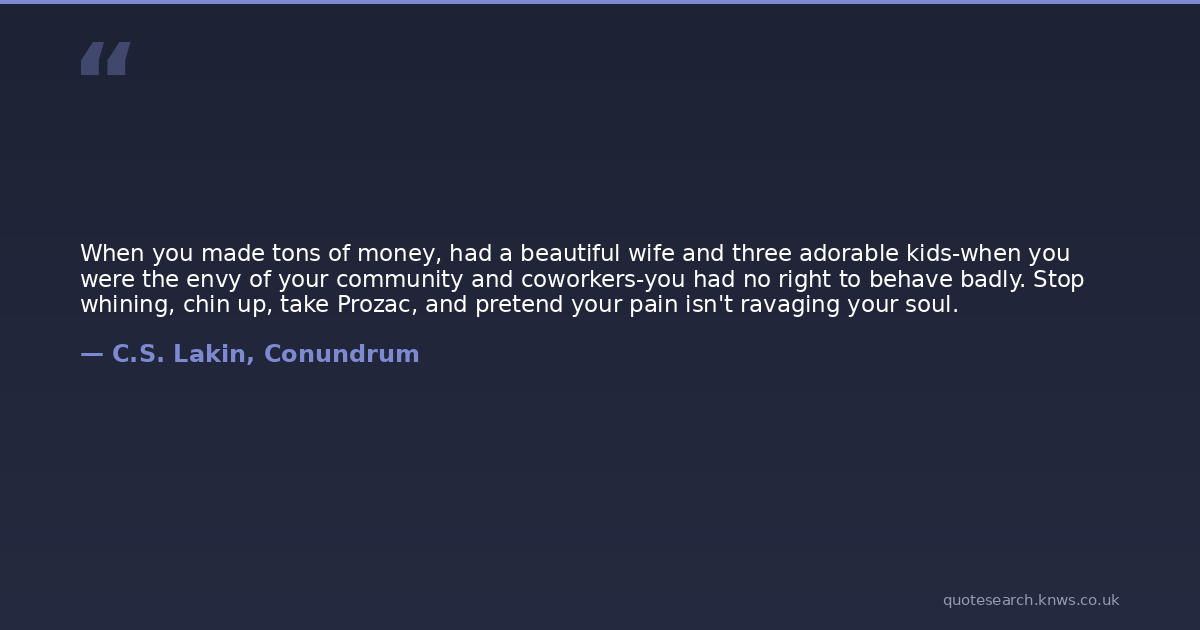 When you made tons of money, had a beautiful wife and three adorable kids-when you were the envy of your community and coworkers-you had no right to behave badly. Stop whining, chin up, take Prozac, and pretend your pain isn't ravaging your soul.