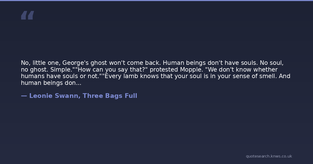 No, little one, George's ghost won't come back. Human beings don't have souls. No soul, no ghost. Simple.""How can you say that?" protested Mopple. "We don't know whether humans have souls or not.""Every lamb knows that your soul is in your sense of smell. And human beings don't have very good noses." Maude herself had an excellent sense of smell, and often thought about the problem of souls and noses."So you'd only see a very small ghost. Nothing to be afraid of.