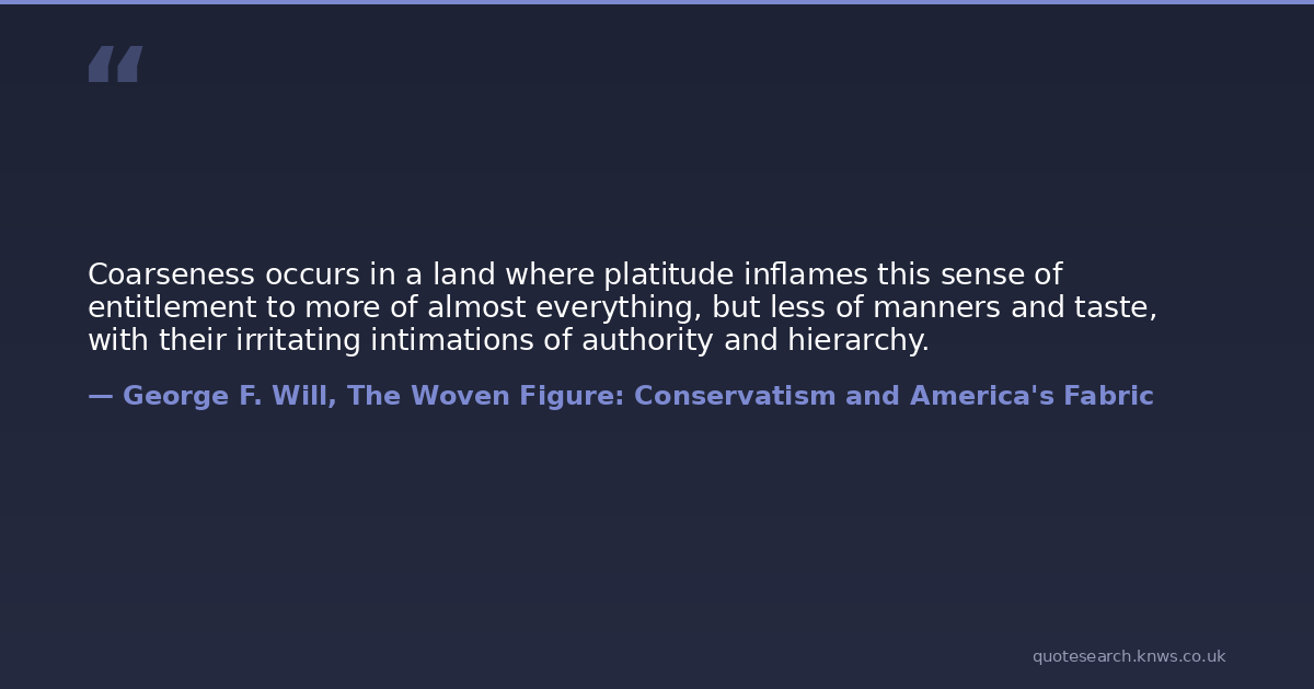 Coarseness occurs in a land where platitude inflames this sense of entitlement to more of almost everything, but less of manners and taste, with their irritating intimations of authority and hierarchy.