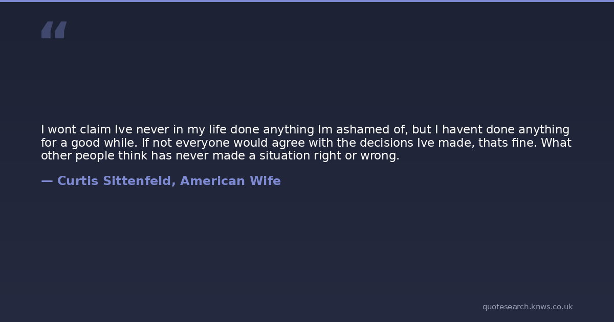 I wont claim Ive never in my life done anything Im ashamed of, but I havent done anything for a good while. If not everyone would agree with the decisions Ive made, thats fine. What other people think has never made a situation right or wrong.
