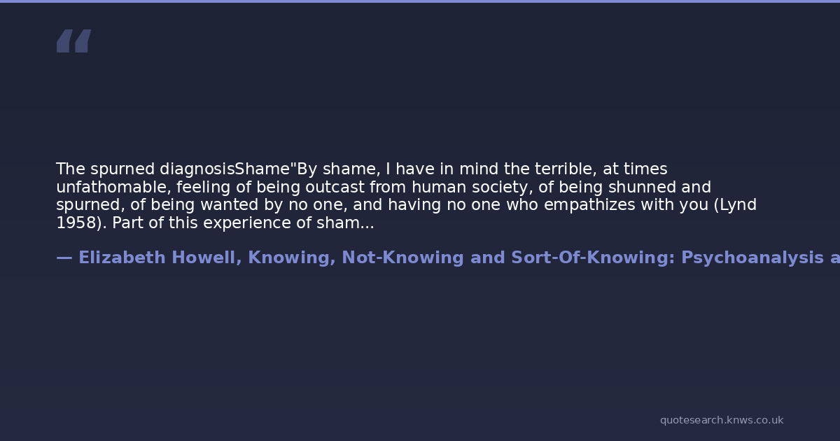The spurned diagnosisShame"By shame, I have in mind the terrible, at times unfathomable, feeling of being outcast from human society, of being shunned and spurned, of being wanted by no one, and having no one who empathizes with you (Lynd 1958). Part of this experience of shame is the focus on the inadequacies of oneself in the eyes of others and oneself, and of feeling mortified, wanting to disappear, to hide inside a crack in the wall (Lewis 1971).