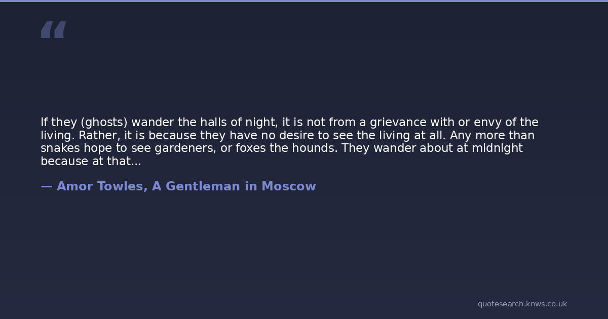 If they (ghosts) wander the halls of night, it is not from a grievance with or envy of the living. Rather, it is because they have no desire to see the living at all. Any more than snakes hope to see gardeners, or foxes the hounds. They wander about at midnight because at that hour they can generally do so without being harried by the sound and fury of earthly emotions. After all those years of striving and struggling, of hoping and praying, of shouldering expectations, stomaching opinions, navigating decorum, and making conversation, what they seek, quite simply, is a little peace and quiet.