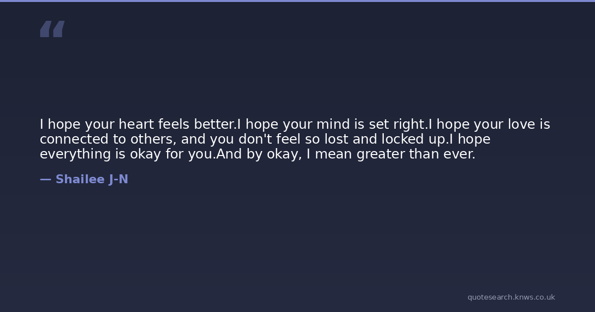 I hope your heart feels better.I hope your mind is set right.I hope your love is connected to others, and you don't feel so lost and locked up.I hope everything is okay for you.And by okay, I mean greater than ever.
