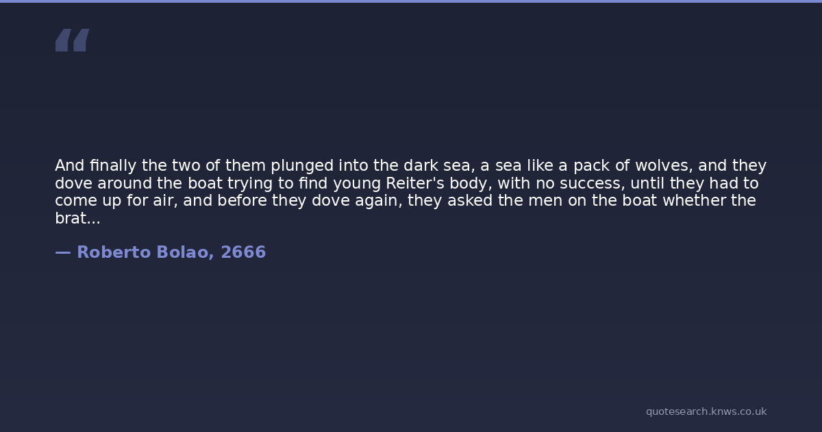 And finally the two of them plunged into the dark sea, a sea like a pack of wolves, and they dove around the boat trying to find young Reiter's body, with no success, until they had to come up for air, and before they dove again, they asked the men on the boat whether the brat had surfaced. And then, under the weight of the negative response, they disappeared once more among the dark waves like forest beasts and one of the men who hadn't been in before joined them, and it was he who some fifteen feet down spotted the body of young Reiter floating like uprooted seaweed, upward, a brilliant white in the underwater space, and it was he who grabbed the body under the arms and brought him up, and also he who made the young Reiter vomit all the water he had swallowed.