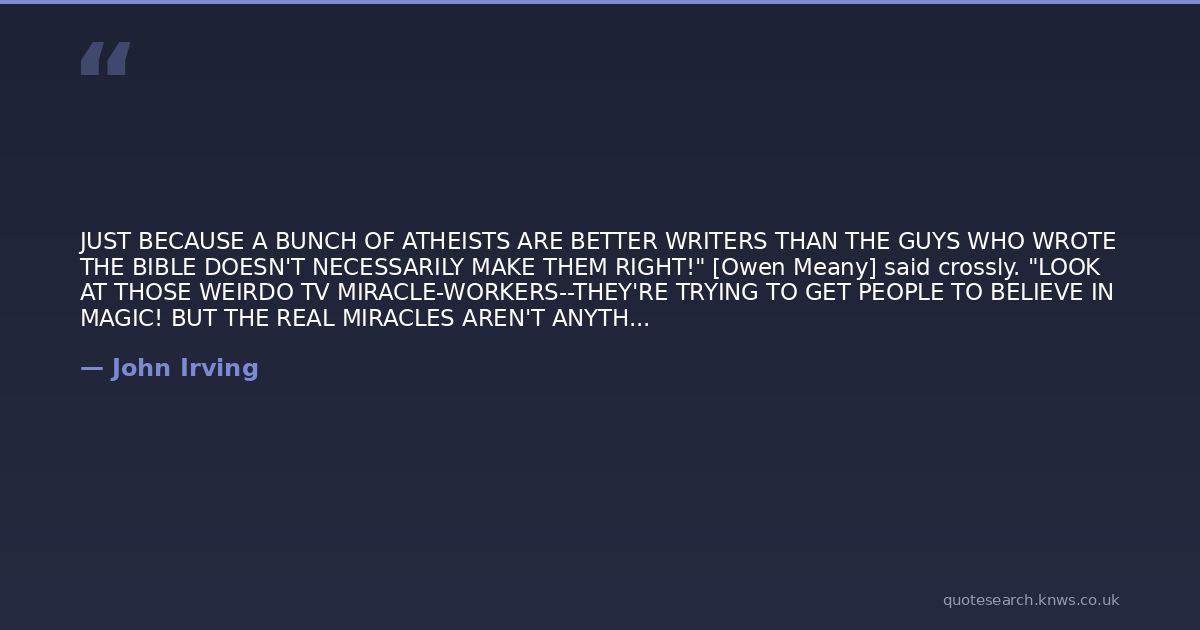 JUST BECAUSE A BUNCH OF ATHEISTS ARE BETTER WRITERS THAN THE GUYS WHO WROTE THE BIBLE DOESN'T NECESSARILY MAKE THEM RIGHT!" [Owen Meany] said crossly. "LOOK AT THOSE WEIRDO TV MIRACLE-WORKERS--THEY'RE TRYING TO GET PEOPLE TO BELIEVE IN MAGIC! BUT THE REAL MIRACLES AREN'T ANYTHING YOU CAN SEE--THEY'RE THINGS YOU HAVE TO BELIEVE WITHOUT SEEING. IF SOME PREACHER'S AN ASSHOLE, THAT'S NOT PROOF THAT GOD DOESN'T EXIST!