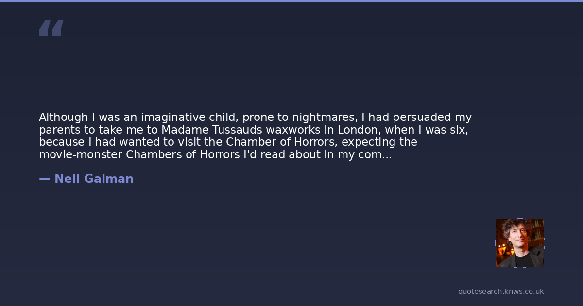 Although I was an imaginative child, prone to nightmares, I had persuaded my parents to take me to Madame Tussauds waxworks in London, when I was six, because I had wanted to visit the Chamber of Horrors, expecting the movie-monster Chambers of Horrors I'd read about in my comics. I had wanted to thrill to waxworks of Dracula and Frankenstein's Monster and the Wolf-man. Instead I was walked through a seemingly endless sequence of dioramas of unremarkable, glum-looking men and women who had murdered people - usually lodgers and members of their own families - and who were then murdered in turn: by handing, by the electric chair, in gas chambers. Most of them were depicted with their victims in awkward social situations - seated about a dinner table, perhaps, as their poisoned family members expired. The plaques that explained who they were also told me that the majority of them had murdered their families and sold the bodies to anatomy. It was then that the word anatomy garnered its own edge of horror for me. I did not know what anatomy was. I knew only that anatomy made people kill their children.