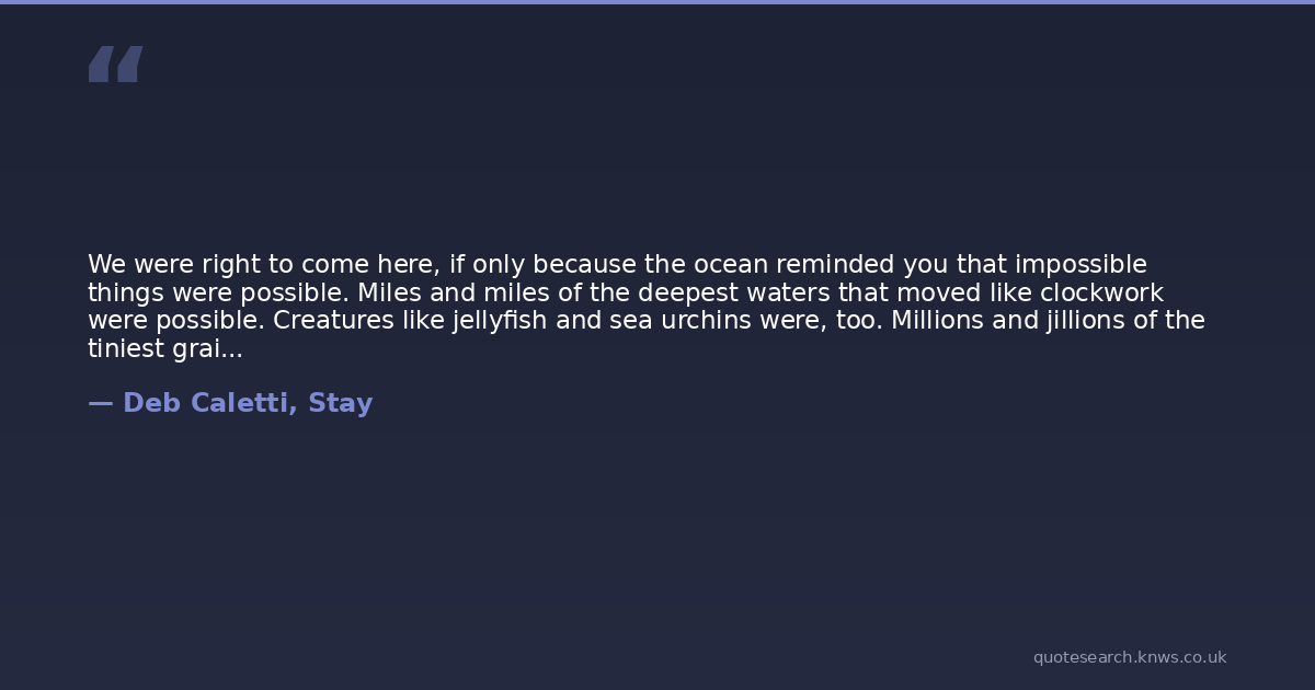 We were right to come here, if only because the ocean reminded you that impossible things were possible. Miles and miles of the deepest waters that moved like clockwork were possible. Creatures like jellyfish and sea urchins were, too. Millions and jillions of the tiniest grains of sand to form one long, soft beachyep, even that was possible.
