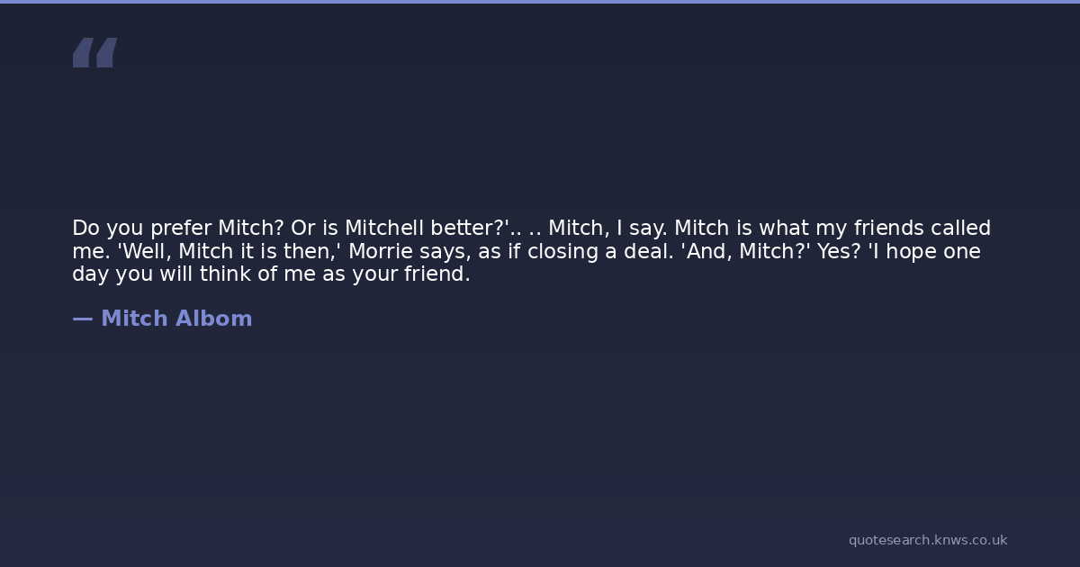Do you prefer Mitch? Or is Mitchell better?'.. .. Mitch, I say. Mitch is what my friends called me. 'Well, Mitch it is then,' Morrie says, as if closing a deal. 'And, Mitch?' Yes? 'I hope one day you will think of me as your friend.
