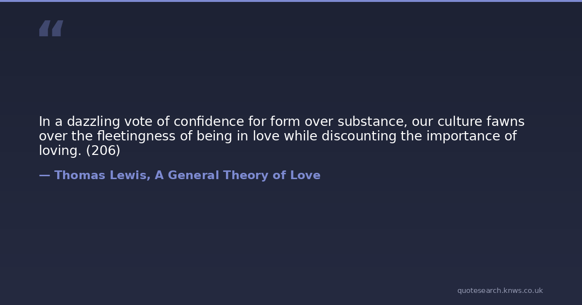 In a dazzling vote of confidence for form over substance, our culture fawns over the fleetingness of being in love while discounting the importance of loving. (206)
