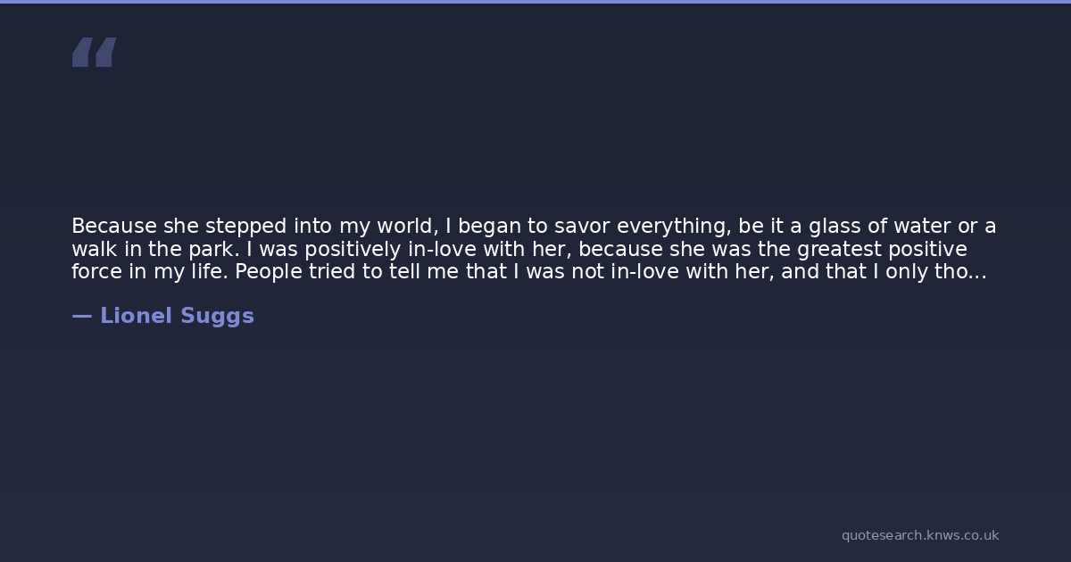 Because she stepped into my world, I began to savor everything, be it a glass of water or a walk in the park. I was positively in-love with her, because she was the greatest positive force in my life. People tried to tell me that I was not in-love with her, and that I only thought that I was. However, reality is almost always wrong, and no one sees the world the way that I do. No one sees her the way that I do. She is the one that puts flavor into my water, and makes an average walk in the park absolutely divine. In my world, in my reality, she is the one that I choose to be in-love with.