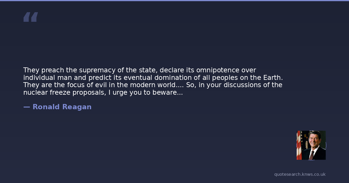 They preach the supremacy of the state, declare its omnipotence over individual man and predict its eventual domination of all peoples on the Earth. They are the focus of evil in the modern world.... So, in your discussions of the nuclear freeze proposals, I urge you to beware the temptation of pride, the temptation of blithely declaring yourselves above it all and label both sides equally at fault, to ignore the facts of history and the aggressive impulses of an evil empire, to simply call the arms race a giant misunderstanding and thereby remove yourself from the struggle between right and wrong and good and evil.