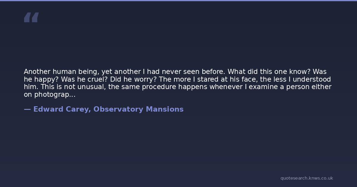 Another human being, yet another I had never seen before. What did this one know? Was he happy? Was he cruel? Did he worry? The more I stared at his face, the less I understood him. This is not unusual, the same procedure happens whenever I examine a person either on photograph or in reality: in my first glimpses I always think I can read someone fairly quickly, that the snap judgements I make are surely accurate, but the more I observe the less I understand, the more I realize how difficult the art of judging a person is.