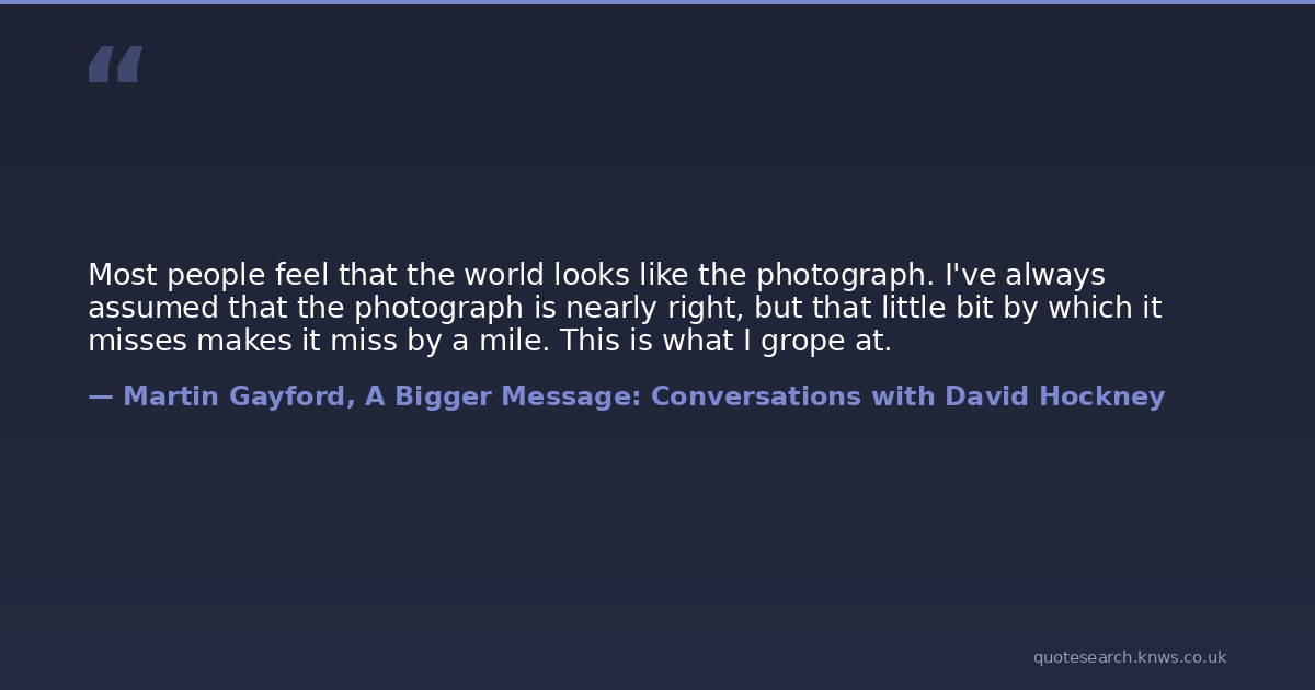 Most people feel that the world looks like the photograph. I've always assumed that the photograph is nearly right, but that little bit by which it misses makes it miss by a mile. This is what I grope at.