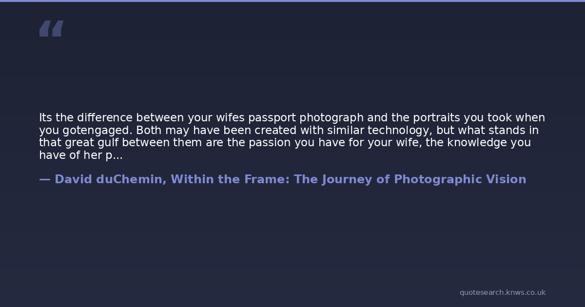 Its the difference between your wifes passport photograph and the portraits you took when you gotengaged. Both may have been created with similar technology, but what stands in that great gulf between them are the passion you have for your wife, the knowledge you have of her personality, and your willingness to use your craft, time, and energy to express that. One says, She looks like this. The other says, This is who she is to me. Its how I feel about her. See how amazing she is?
