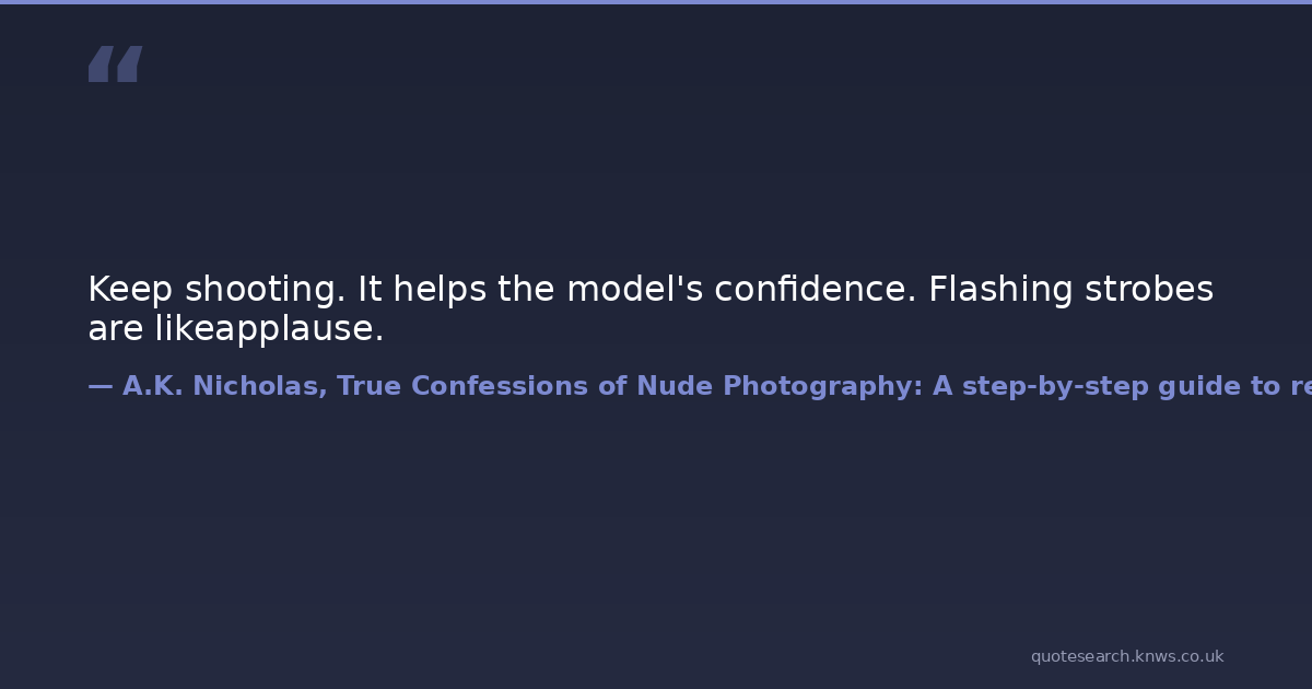 Keep shooting. It helps the model's confidence. Flashing strobes are likeapplause. modeling nude photography Download Image Share on X Share on Facebook Copy Link