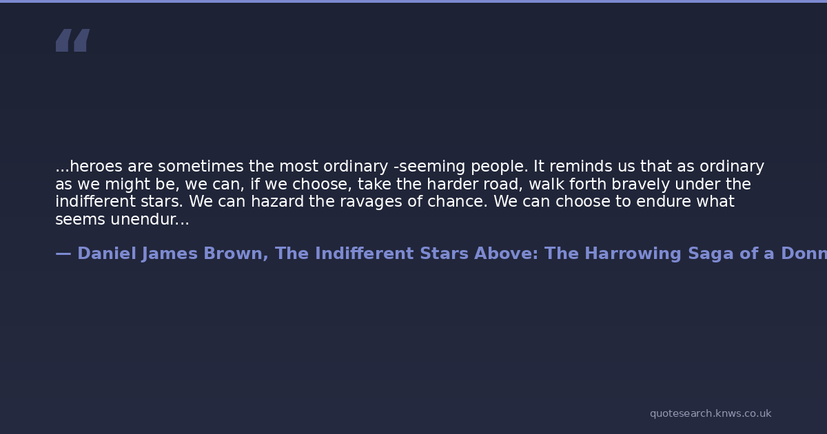 ...heroes are sometimes the most ordinary -seeming people. It reminds us that as ordinary as we might be, we can, if we choose, take the harder road, walk forth bravely under the indifferent stars. We can hazard the ravages of chance. We can choose to endure what seems unendurable, and thereby open up the possibility of prevailing. We can awaken to the world as it is, and seeing it with eyes wide open, we can nevertheless embrace hope rather than despair.
