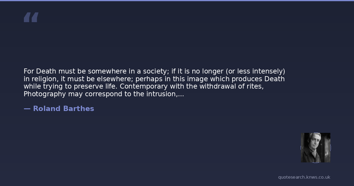 For Death must be somewhere in a society; if it is no longer (or less intensely) in religion, it must be elsewhere; perhaps in this image which produces Death while trying to preserve life. Contemporary with the withdrawal of rites, Photography may correspond to the intrusion, in our modern society, of an asymbolic Death, outside of religion, outside of ritual, a kind of abrupt dive into literal Death.