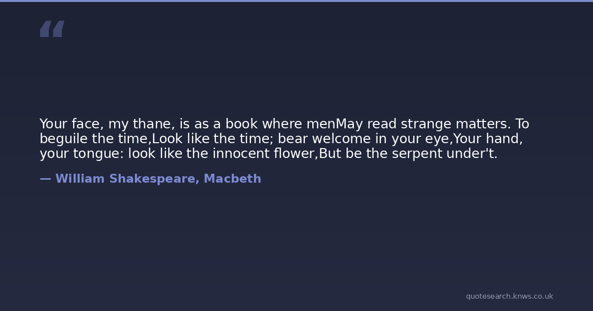 Your face, my thane, is as a book where menMay read strange matters. To beguile the time,Look like the time; bear welcome in your eye,Your hand, your tongue: look like the innocent flower,But be the serpent under't.