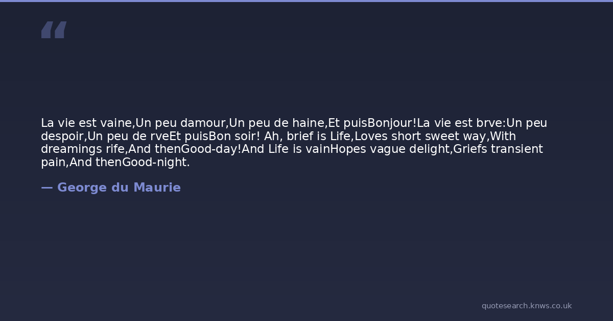 La vie est vaine,Un peu damour,Un peu de haine,Et puisBonjour!La vie est brve:Un peu despoir,Un peu de rveEt puisBon soir! Ah, brief is Life,Loves short sweet way,With dreamings rife,And thenGood-day!And Life is vainHopes vague delight,Griefs transient pain,And thenGood-night.