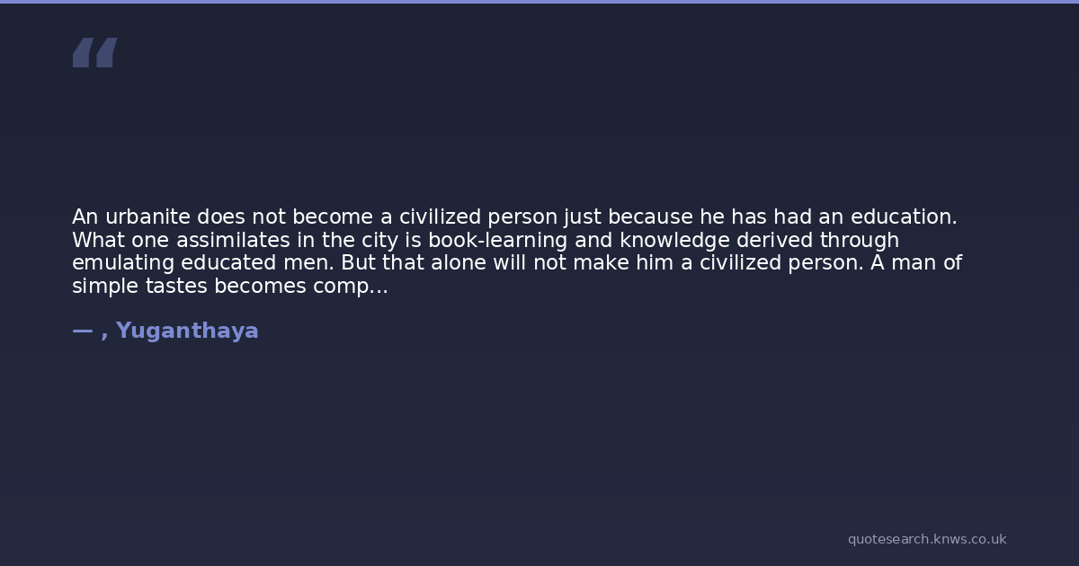 An urbanite does not become a civilized person just because he has had an education. What one assimilates in the city is book-learning and knowledge derived through emulating educated men. But that alone will not make him a civilized person. A man of simple tastes becomes complex through education because he desires to become complex. That is why a lot of educated men enjoy vulgar and obscene things. The cinema has become a vulgar philistine art form. The enormous motor car with its bloated body is a vulgar vehicle. It is difficult to create a complex thing without some vulgarity and grossness. Amongst the things valued by the educated, it is difficult to find things untainted by vulgarity. People who cannot distinguish between grossness and refinement are not uncommon among the urban educated because for many, the measure of civilization is its complexity.