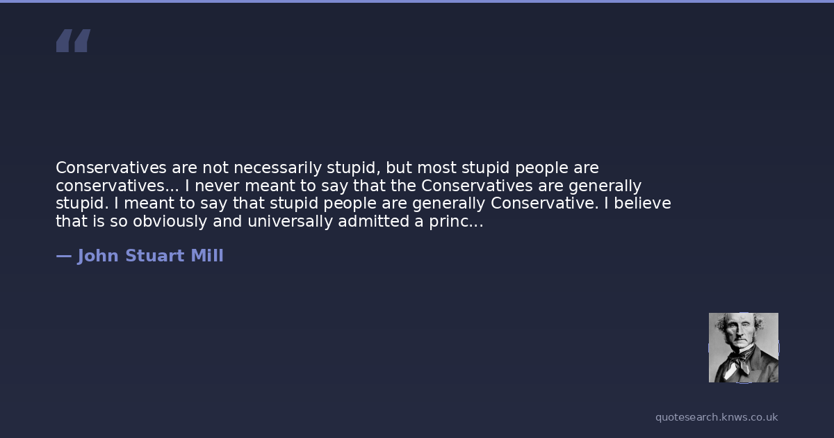 Conservatives are not necessarily stupid, but most stupid people are conservatives... I never meant to say that the Conservatives are generally stupid. I meant to say that stupid people are generally Conservative. I believe that is so obviously and universally admitted a principle that I hardly think any gentleman will deny it. Suppose any party, in addition to whatever share it may possess of the ability of the community, has nearly the whole of its stupidity, that party must, by the law of its constitution, be the stupidest party; and I do not see why honorable gentlemen should see that position as at all offensive to them, for it ensures their being always an extremely powerful party . . . There is so much dense, solid force in sheer stupidity, that any body of able men with that force pressing behind them may ensure victory in many a struggle, and many a victory the Conservative party has gained through that power."John Stuart Mill ( British philosopher, economist, and liberal member of Parliament for Westminster from 1865 to 68 )
