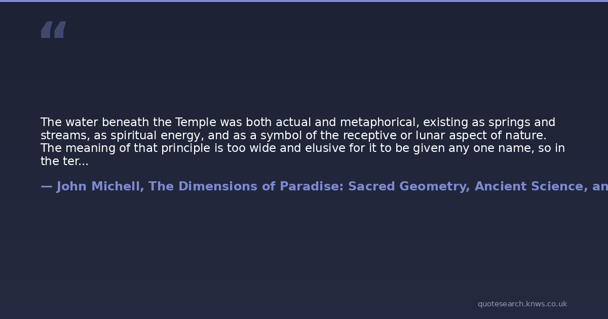 The water beneath the Temple was both actual and metaphorical, existing as springs and streams, as spiritual energy, and as a symbol of the receptive or lunar aspect of nature. The meaning of that principle is too wide and elusive for it to be given any one name, so in the terminology of ancient science it was given a number, 1,080. Its polar opposite, the positive, solar force in the universe, was also referred to as a number 666. These two numbers, which have an approximate golden-section relationship of 1:1.62, were at the root of the alchemical formula that expressed the supreme purpose of the Temple. Its polar opposite, the positive, solar force in the universe, was also referred to as a number 666. Not merely was it used to generate energy from fusion of atmospheric and terrestrial currents, but it also served to combine in harmony all the correspondences of those forces on every level of creation.