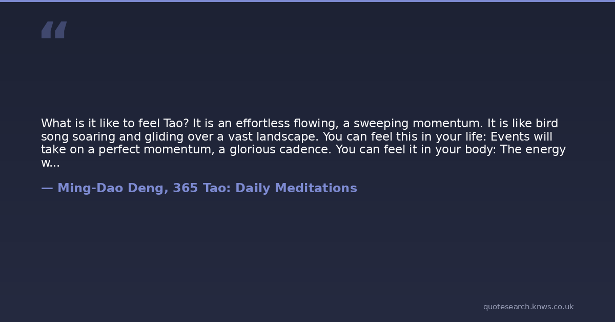 What is it like to feel Tao? It is an effortless flowing, a sweeping momentum. It is like bird song soaring and gliding over a vast landscape. You can feel this in your life: Events will take on a perfect momentum, a glorious cadence. You can feel it in your body: The energy will rise up in you in a thrilling crescendo, setting your very nerves aglow. You can feel it in your spirit: You will enter a state of such perfect grace that you will resound over the landscape of reality like ephemeral bird song.When Tao comes to you in this way, ride it for all that you are worth. Don't interfere. Don't stop - that brings failure, alienation, and regret. Don't try to direct it. Let it flow and follow it. When the Tao is with you, put aside all other concerns. As long as the song lasts, follow. Just follow.