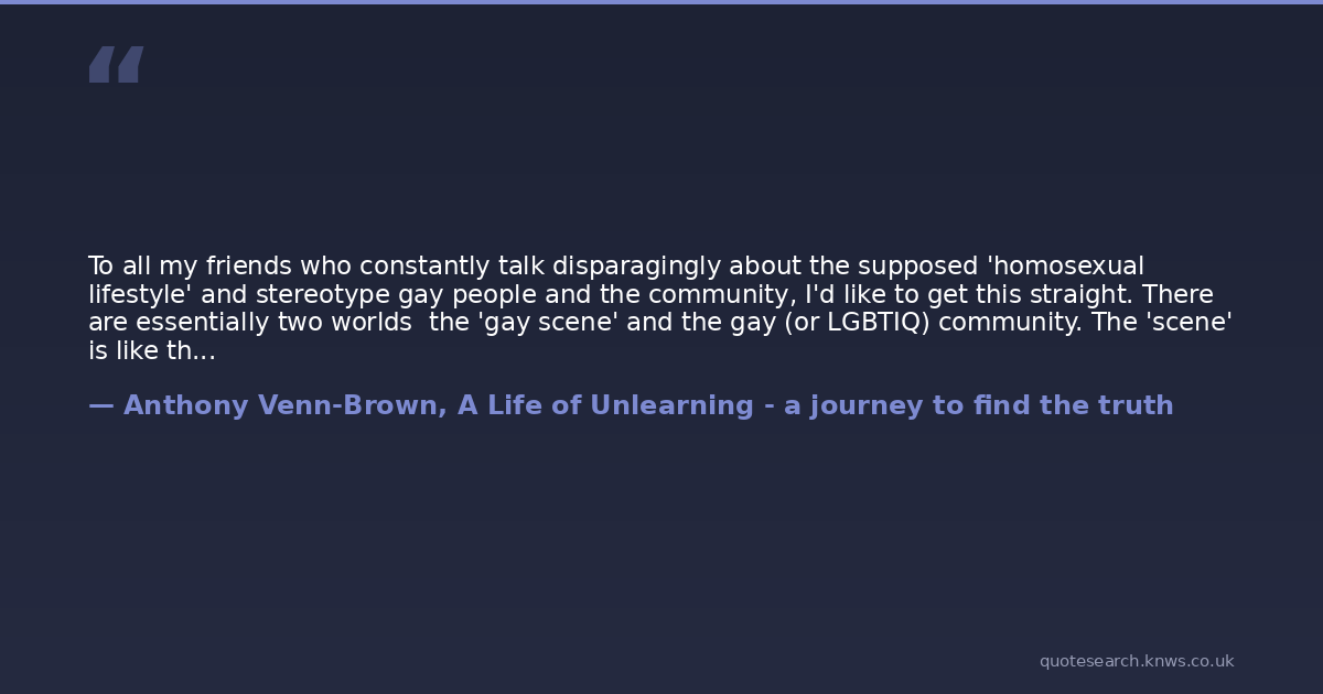 To all my friends who constantly talk disparagingly about the supposed 'homosexual lifestyle' and stereotype gay people and the community, I'd like to get this straight. There are essentially two worlds the 'gay scene' and the gay (or LGBTIQ) community. The 'scene' is like the tip of the iceberg; what is seen by others because it is visible on a street, suburb or pride parade. Like the ninety percent of the submerged iceberg, the community is larger and less visible. It consists of organisations, groups, support networks and also gay and lesbian singles and couples living 'normal' lives in the suburbs. Occasionally there is an overlap but not often. Some live, socialise and work in both. Many never enter each others worlds. The values, lifestyles and culture of these two worlds are as different as Asian culture is to western is to African is to Middle Eastern. Dig down even deeper below the surface and you find it is not a single community but diverse communities and subcultures that are separate but not necessarily divided. The common thing that binds them together is their experience of inequality, discrimination and their desire to make a better world for themselves, others and future generations. If you believe that all gays and lesbians are shallow and obsessed with sex, body image, partying, nightclubs and bars then you are obviously an observer from the outside or mixing in the wrong circles.