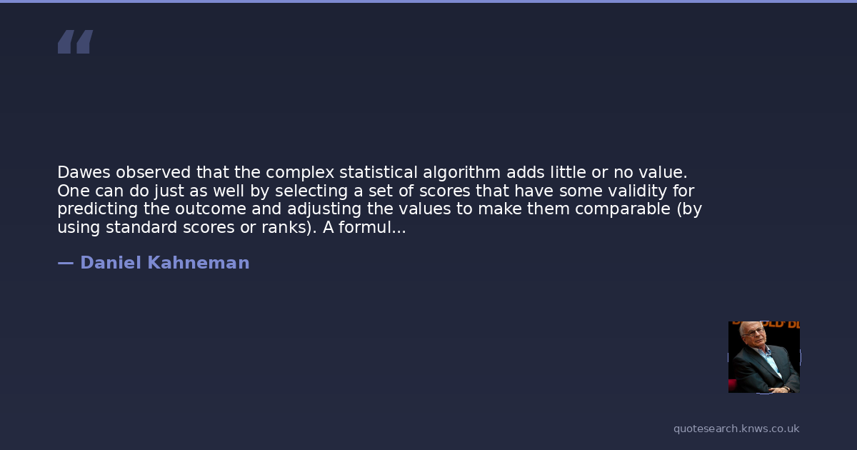 Dawes observed that the complex statistical algorithm adds little or no value. One can do just as well by selecting a set of scores that have some validity for predicting the outcome and adjusting the values to make them comparable (by using standard scores or ranks). A formula that combines these predictors with equal weights is likely to be just as accurate in predicting new cases as the multiple-regression formula that was optimal in the original sample. More recent research went further: formulas that assign equal weights to all the predictors are often superior, because they are not affected by accidents of sampling.