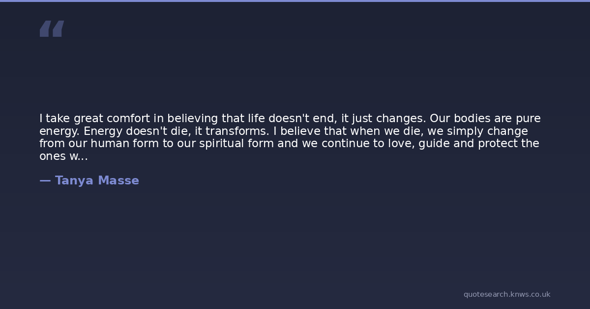 I take great comfort in believing that life doesn't end, it just changes. Our bodies are pure energy. Energy doesn't die, it transforms. I believe that when we die, we simply change from our human form to our spiritual form and we continue to love, guide and protect the ones we love on earth, as much as our energy will allow. It is the only logical explanation that makes perfect sense. - Tanya Masse aka Comic Strip Mama