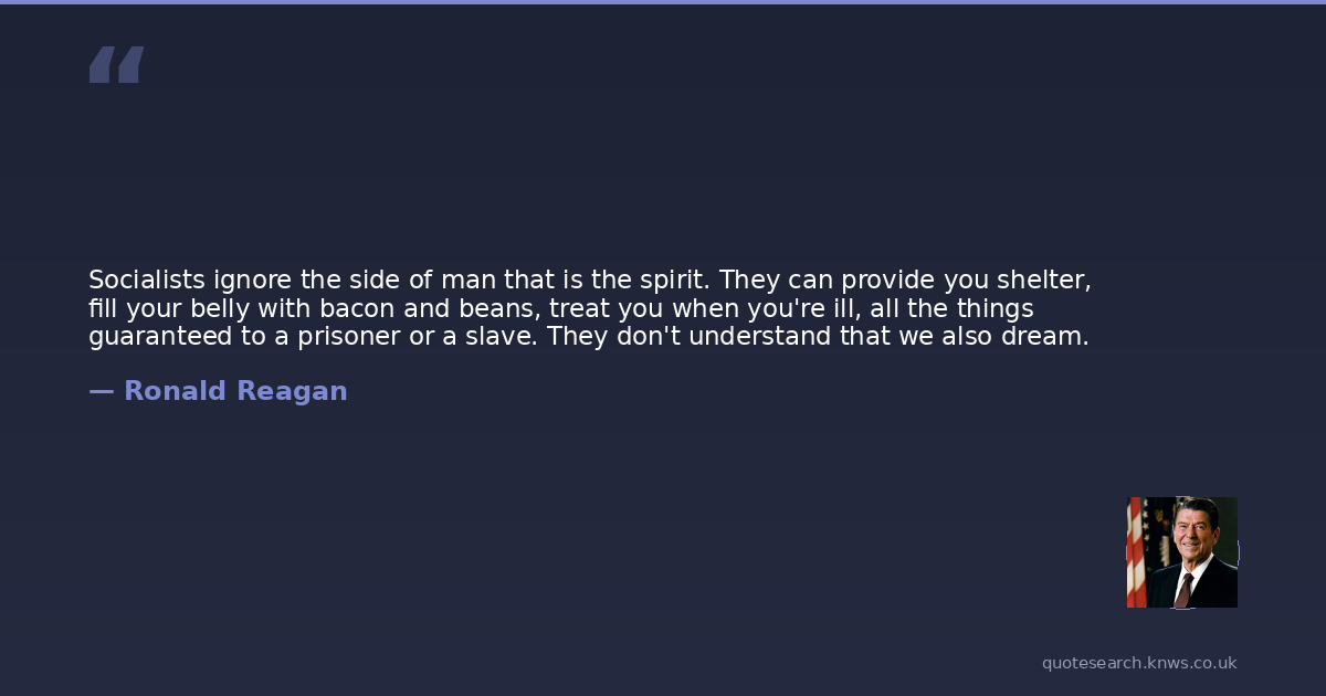 Socialists ignore the side of man that is the spirit. They can provide you shelter, fill your belly with bacon and beans, treat you when you're ill, all the things guaranteed to a prisoner or a slave. They don't understand that we also dream.