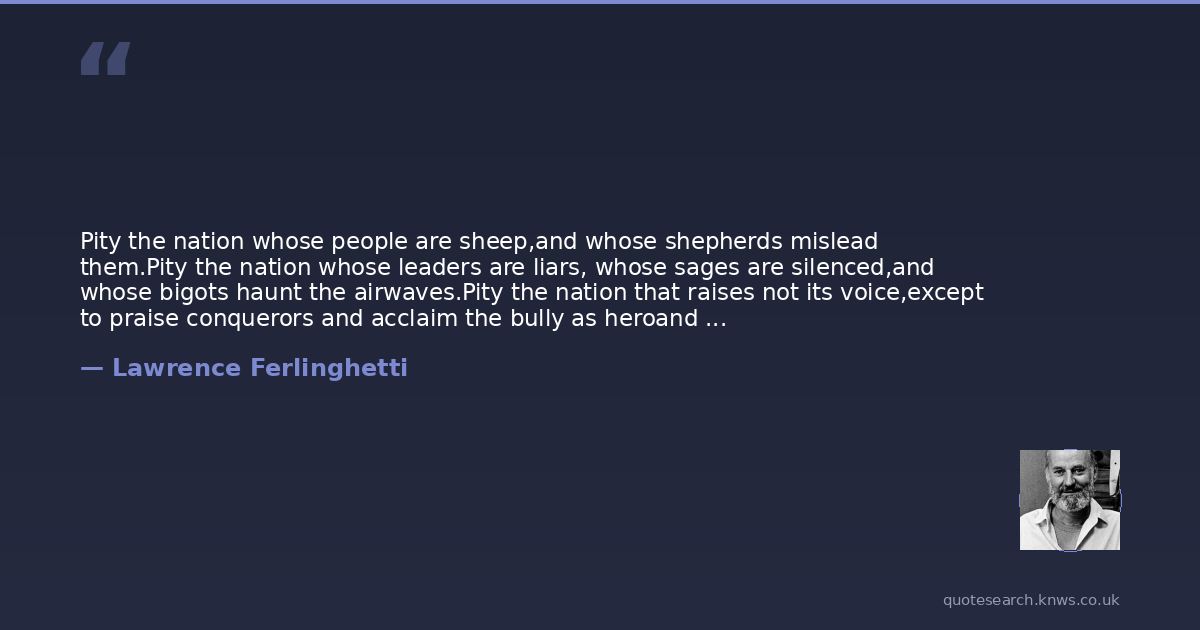 Pity the nation whose people are sheep,and whose shepherds mislead them.Pity the nation whose leaders are liars, whose sages are silenced,and whose bigots haunt the airwaves.Pity the nation that raises not its voice,except to praise conquerors and acclaim the bully as heroand aims to rule the world with force and by torture.Pity the nation that knows no other language but its ownand no other culture but its own.Pity the nation whose breath is moneyand sleeps the sleep of the too well fed.Pity the nation oh, pity the people who allow their rights to erodeand their freedoms to be washed away.My country, tears of thee, sweet land of liberty.