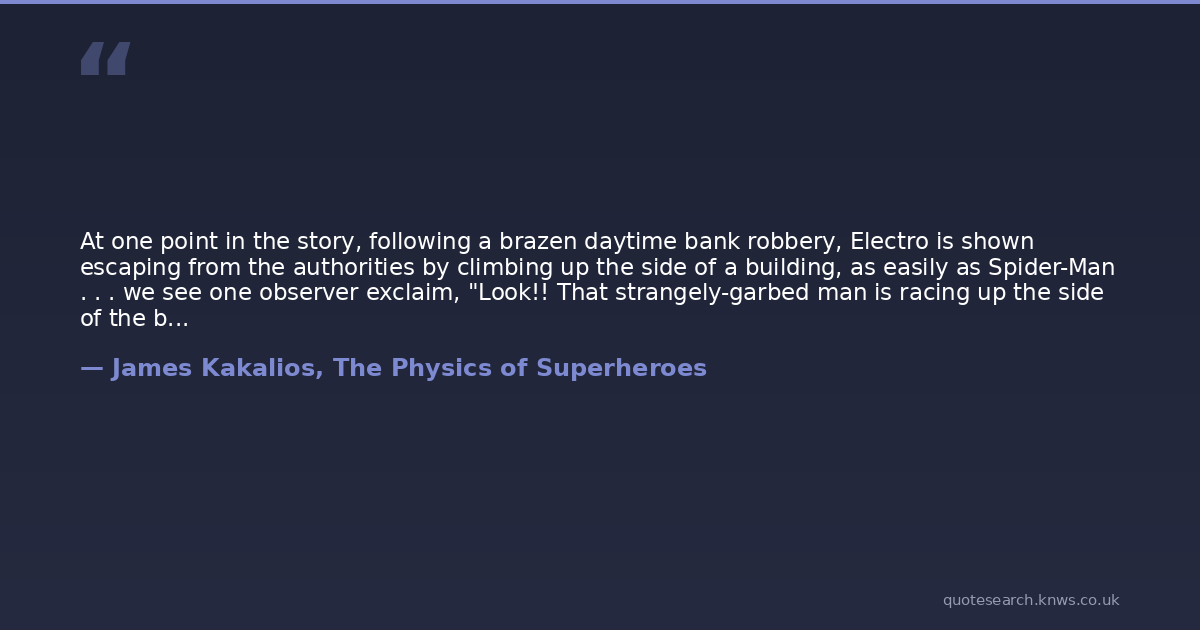 At one point in the story, following a brazen daytime bank robbery, Electro is shown escaping from the authorities by climbing up the side of a building, as easily as Spider-Man . . . we see one observer exclaim, "Look!! That strangely-garbed man is racing up the side of the building!" A second man on the street picks up the narrative: "He's holding on to the iron beams in the building by means of electric raysusing them like a magnet!! Incredible!"There are three feelings inspired by this scene. The first is wonder as to why people rarely use the phrase "strangely-garbed" anymore. The second is nostalgia for the bygone era when pedestrians would routinely narrate events occurring in front of them, providing exposition for any casual bystander. And the third is pleasure at the realization that Electro's climbing this building is actually a physically plausible use of his powers.