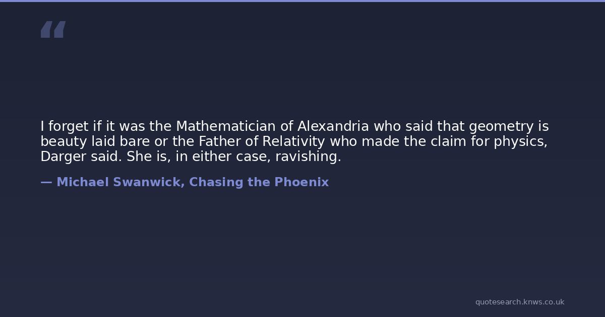 I forget if it was the Mathematician of Alexandria who said that geometry is beauty laid bare or the Father of Relativity who made the claim for physics, Darger said. She is, in either case, ravishing.