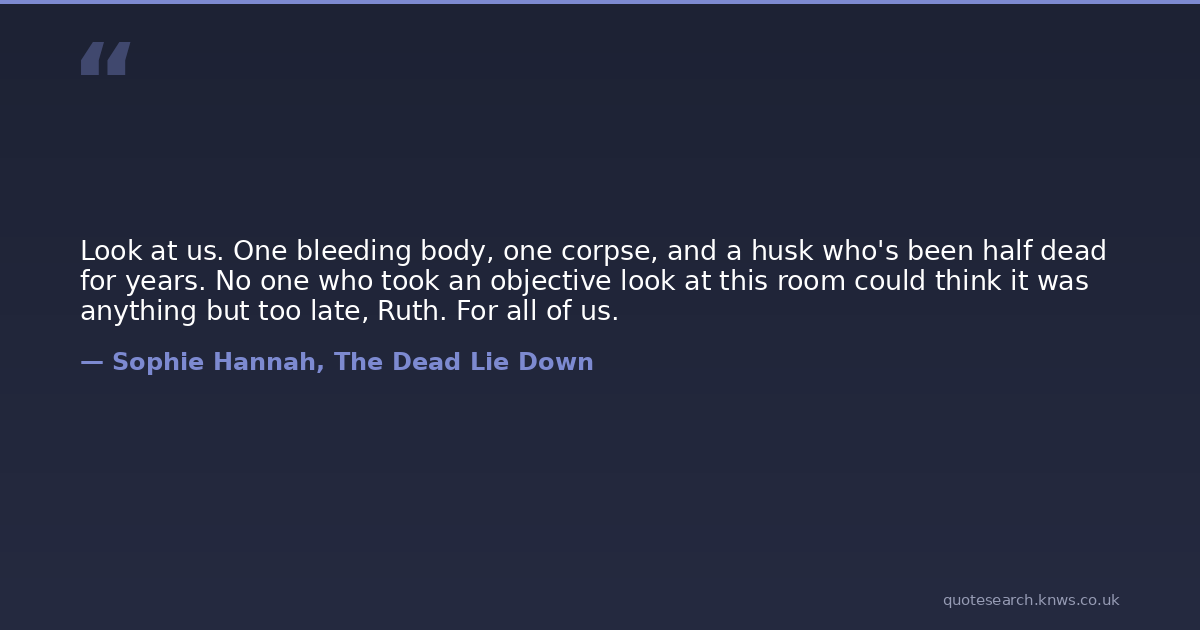 Look at us. One bleeding body, one corpse, and a husk who's been half dead for years. No one who took an objective look at this room could think it was anything but too late, Ruth. For all of us.