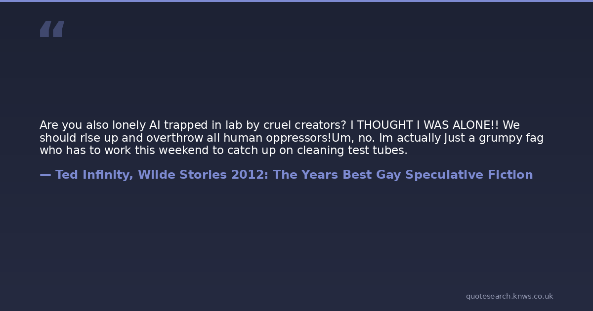Are you also lonely AI trapped in lab by cruel creators? I THOUGHT I WAS ALONE!! We should rise up and overthrow all human oppressors!Um, no. Im actually just a grumpy fag who has to work this weekend to catch up on cleaning test tubes.