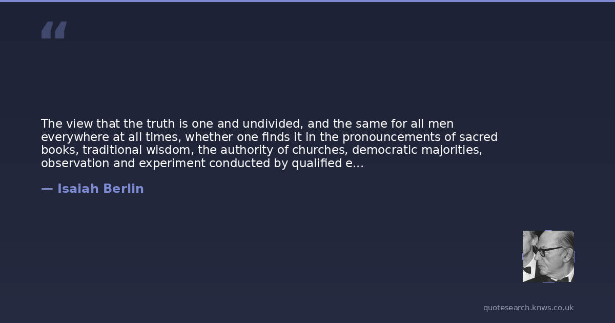 The view that the truth is one and undivided, and the same for all men everywhere at all times, whether one finds it in the pronouncements of sacred books, traditional wisdom, the authority of churches, democratic majorities, observation and experiment conducted by qualified experts, or the convictions of simple folks uncorrupted by civilisation---this view, in one form or another, is central to western thought, which stems from Plato and his disciples.