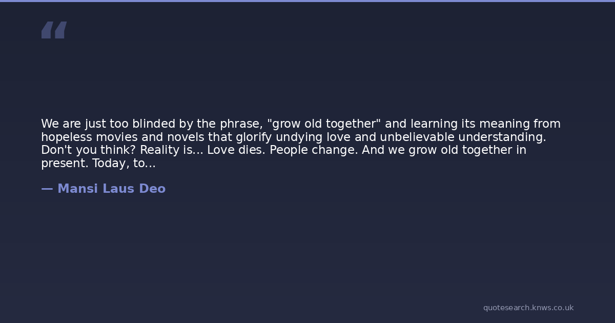 We are just too blinded by the phrase, "grow old together" and learning its meaning from hopeless movies and novels that glorify undying love and unbelievable understanding. Don't you think? Reality is... Love dies. People change. And we grow old together in present. Today, tomorrow, and every day after that.It's not about eternity. It's not till death do us part.It's about today. This day. And I believe only in today.So, come! Let's grow old together today!