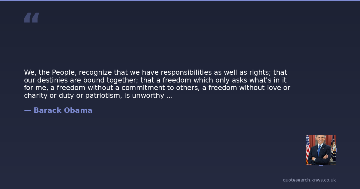 We, the People, recognize that we have responsibilities as well as rights; that our destinies are bound together; that a freedom which only asks what's in it for me, a freedom without a commitment to others, a freedom without love or charity or duty or patriotism, is unworthy of our founding ideals, and those who died in their defense.