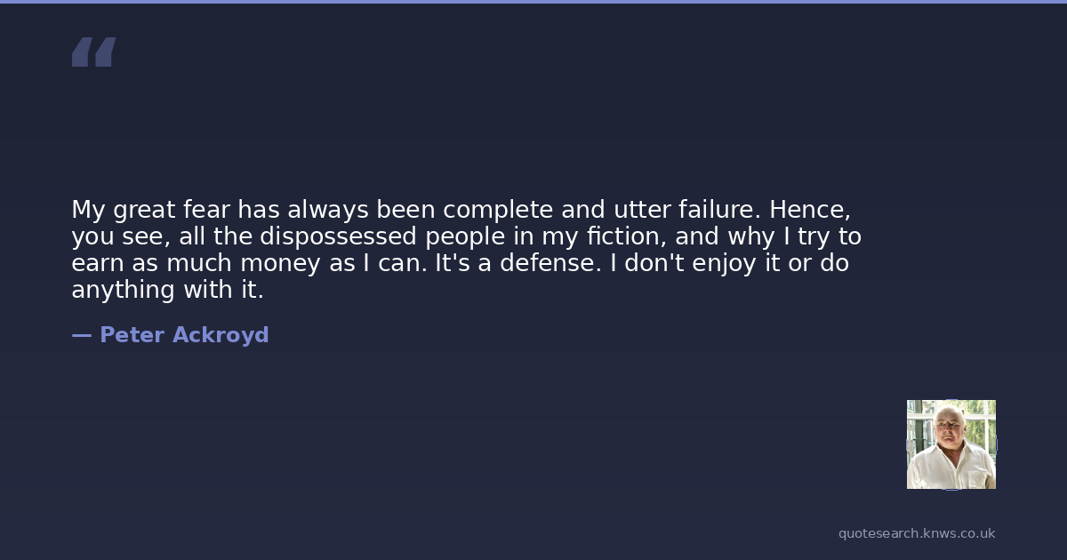 My great fear has always been complete and utter failure. Hence, you see, all the dispossessed people in my fiction, and why I try to earn as much money as I can. It's a defense. I don't enjoy it or do anything with it.