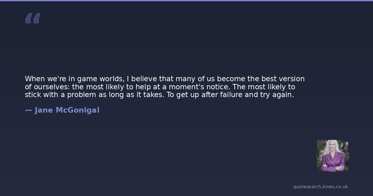 Jane McGonigal was a contemporary American game designer and author. Jane McGonigal is an American author, game designer, and researcher. McGonigal is known for her game Jane the Concussion Slayer and her role as Director of Game Research and Development at Institute for the Future. Read more on Wikipedia →