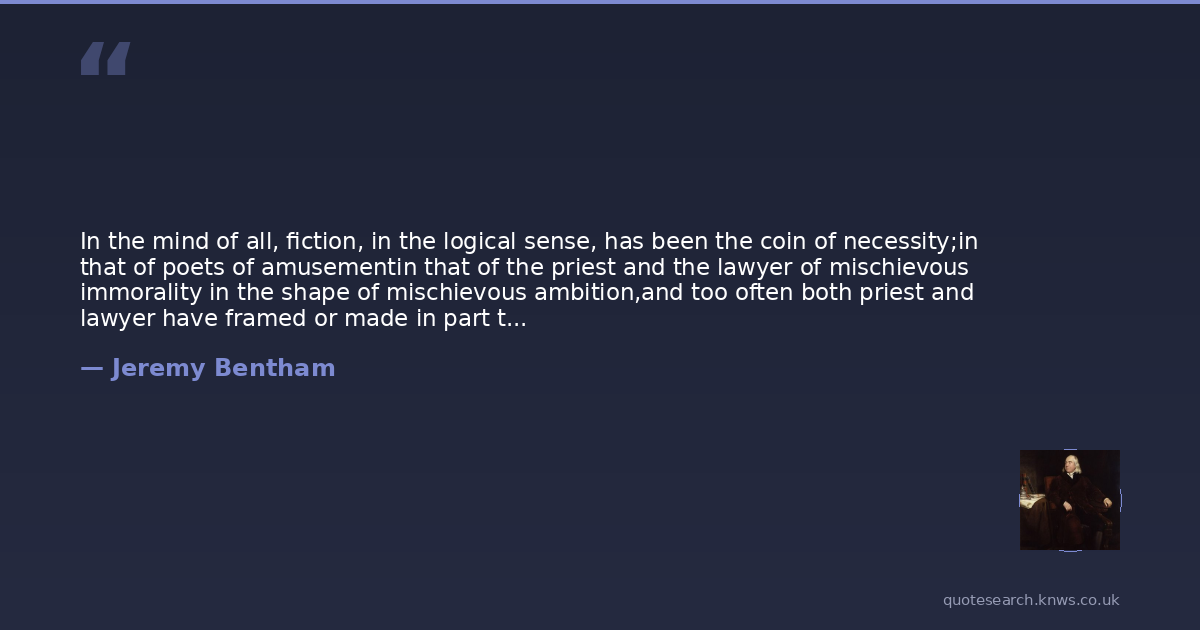 In the mind of all, fiction, in the logical sense, has been the coin of necessity;in that of poets of amusementin that of the priest and the lawyer of mischievous immorality in the shape of mischievous ambition,and too often both priest and lawyer have framed or made in part this instrument.