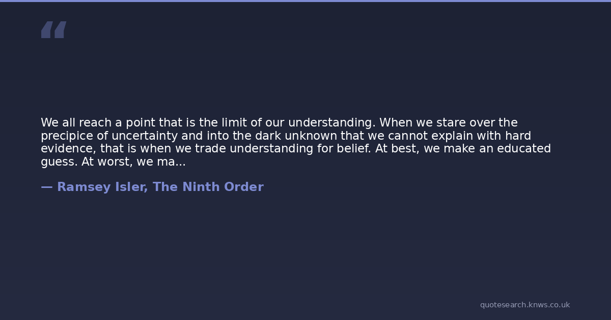 We all reach a point that is the limit of our understanding. When we stare over the precipice of uncertainty and into the dark unknown that we cannot explain with hard evidence, that is when we trade understanding for belief. At best, we make an educated guess. At worst, we make blind leaps of faith.