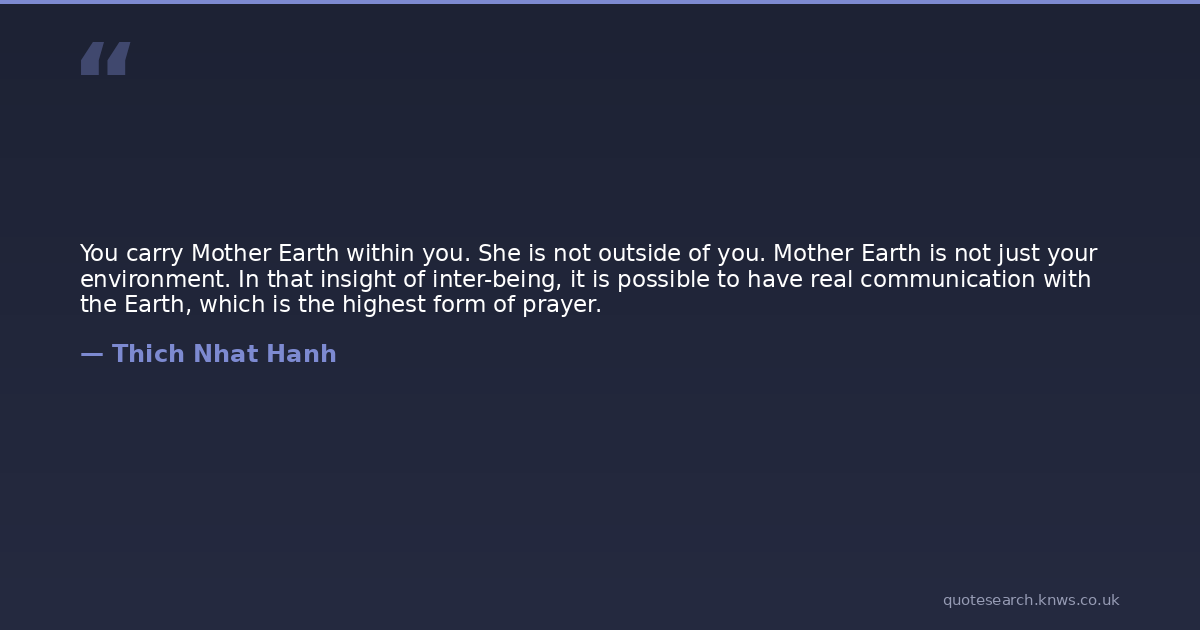 You carry Mother Earth within you. She is not outside of you. Mother Earth is not just your environment. In that insight of inter-being, it is possible to have real communication with the Earth, which is the highest form of prayer.