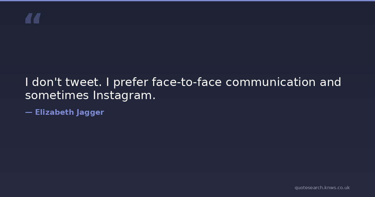 I don't tweet. I prefer face-to-face communication and sometimes Instagram. Sometimes Face-To-Face Download Image Share on X Share on Facebook Copy Link