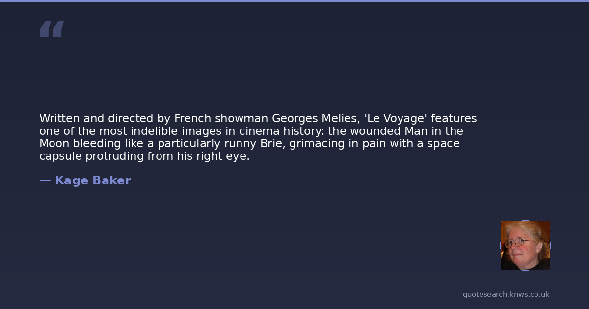 Written and directed by French showman Georges Melies, 'Le Voyage' features one of the most indelible images in cinema history: the wounded Man in the Moon bleeding like a particularly runny Brie, grimacing in pain with a space capsule protruding from his right eye.