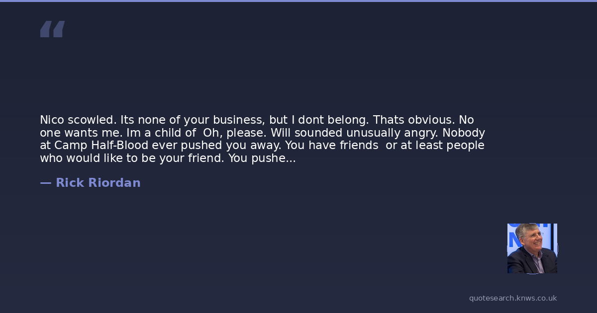 Nico scowled. Its none of your business, but I dont belong. Thats obvious. No one wants me. Im a child of Oh, please. Will sounded unusually angry. Nobody at Camp Half-Blood ever pushed you away. You have friends or at least people who would like to be your friend. You pushed yourself away. If youd get your head out of that brooding cloud of yours for once