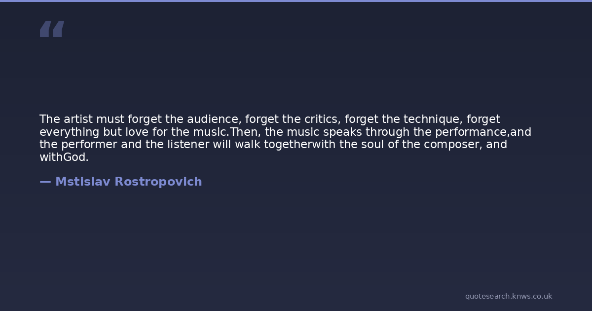 The artist must forget the audience, forget the critics, forget the technique, forget everything but love for the music.Then, the music speaks through the performance,and the performer and the listener will walk togetherwith the soul of the composer, and withGod.