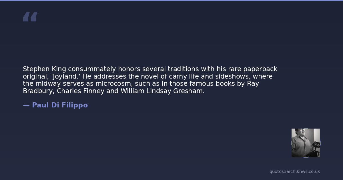 Stephen King consummately honors several traditions with his rare paperback original, 'Joyland.' He addresses the novel of carny life and sideshows, where the midway serves as microcosm, such as in those famous books by Ray Bradbury, Charles Finney and William Lindsay Gresham.